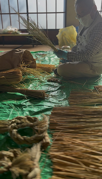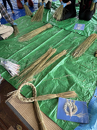 事前に藁を装飾する小幡(家内安全、交通安全)を購入。作業開始の前日には、藁を清めるために海まで向かい、海水につけました。清めるのと同時に、海水につけると塩分によって藁がしなやかになり編みやすくなるとのことでした。